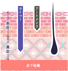 アートメイクとは、皮膚の表皮部分(0.02~0.03mm)だけに専用の針で色素を注入し、染色する美容技術です。医療機関のみが提供できるため「医療アートメイク」と呼ばれます。半永久的に取れないタトゥー(刺青)とは異なり、皮膚のターンオーバーによって徐々に色が薄くなります。